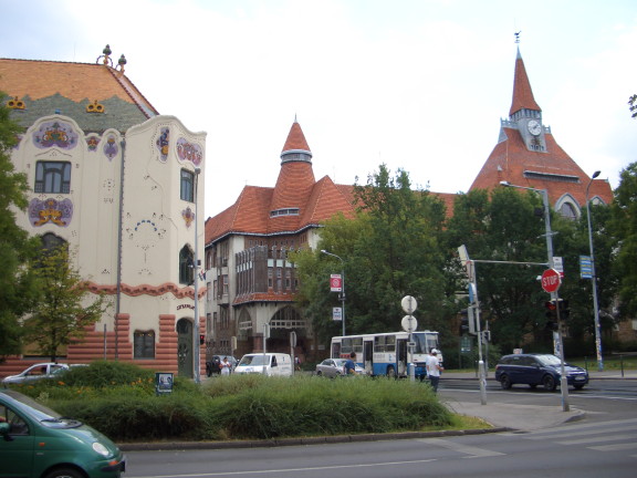 Painted Palace and, on the right, Calvinist church and school - Kecskemét