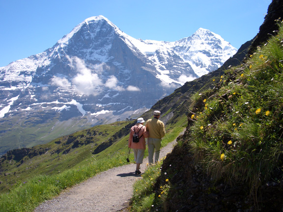 Hikers on train heading toward Eiger and back to Kleine Scheidegg