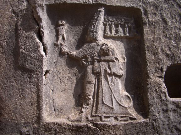 Carving of great king Tudhaliya IV in the embrace of a god, Sharrumma. Rock sanctuary of Yazilikaya, 13th cent. BC. Hattusa