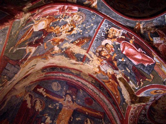 Ceiling of Cankli ("sandals") church, carved into tufa. Shows damage from non-Christians. Cappadocia