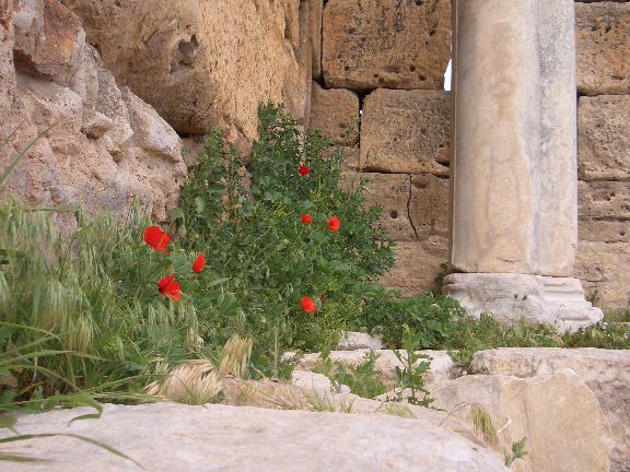 Red poppies (papaver rhoeas), wall and column, Hierapolis. Pamukkale