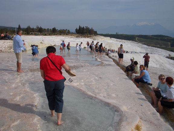 Wading on the travertine terraces at Hierapolis. Pamukkale