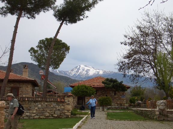 Visitors' center at Aphrodisias, with pines and Taurus mountains