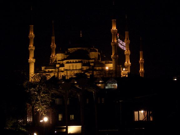 Blue Mosque at night, from terrace of Armada Hotel. Istanbul