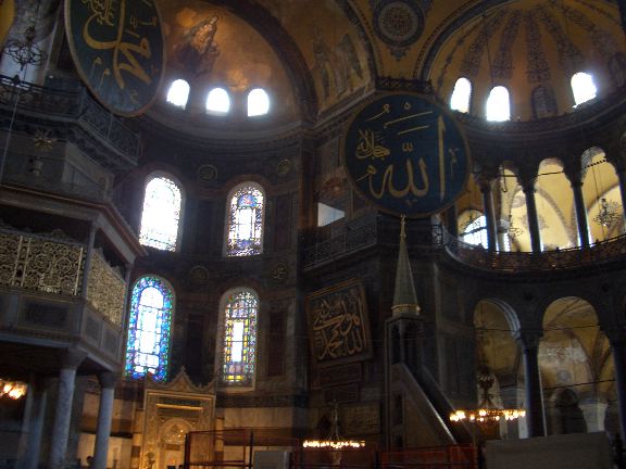 Medallions, domes and pulpit inside Hagia Sophia. Istanbul