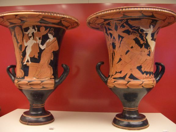 Attic red figure vases (calyx kratons), 340 - 330 BC. Maenads dancing (left). Nike above Theseus slaying the Minotaur (right). National Archeological Museum, Athens