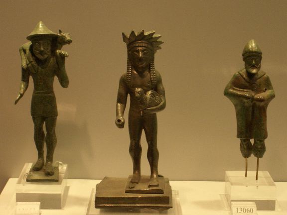 Bronzes from Ardadian sanctuary of Pan. Shepherd with calf, 540 - 520 BC (left). Man with cock, 530 BC (center). Shepherd with hat and cape, 590 - 410 BC (right). National Archeological Museum, Athens