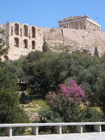 Asklepieion and Parthenon above a Judas Tree, cercis siliquastrum. Athens